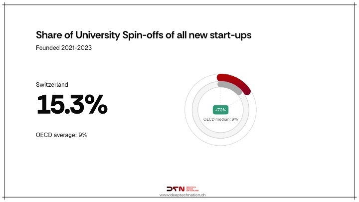 There are three main reasons for this. First: capital intensity. According to our Swiss Deep Tech Report, Switzerland allocates over 60% of venture capital to deep tech—the highest proportion worldwide. This leads to higher capital intensity. Second: ecosystem density. Despite the partly decentralized structure of our ecosystem, geographic distances are much smaller, enabling synergies between cities and ecosystems. Third: university excellence. In European comparison, ETH and EPFL are clearly in the lead.