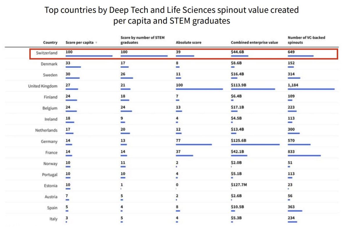 The report highlights the central role of Switzerland’s two federal institutes of technology. In the ranking of top universities for deep tech and life sciences spinout value creation, ETH Zurich ranks third and EPFL ranks fourth in Europe. They sit immediately behind Oxford and Cambridge, placing them at the very apex of continental European innovation.