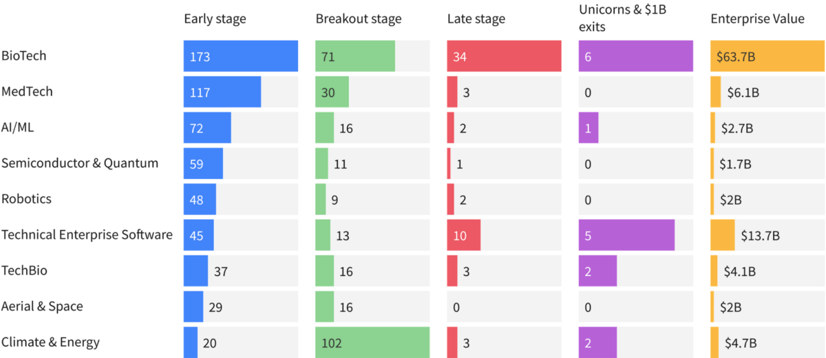 Historically renowned for biotech and micro-engineering, Switzerland’s deep tech landscape has evolved into a diverse ecosystem spanning multiple cutting-edge verticals. While biotech continues to represent the largest share of Swiss startups, the pipeline across quantum technologies, advanced robotics, climate tech, and AI is expanding rapidly. This diversification reflects key structural advantages: world-leading universities like ETH Zurich and EPFL, exceptional technical talent, innovative corporations and Mittelstand companies, business-friendly regulations, and political stability. These factors have cultivated a startup ecosystem now recognized globally as one of the most dynamic, with strength across the full spectrum of deep tech verticals.
